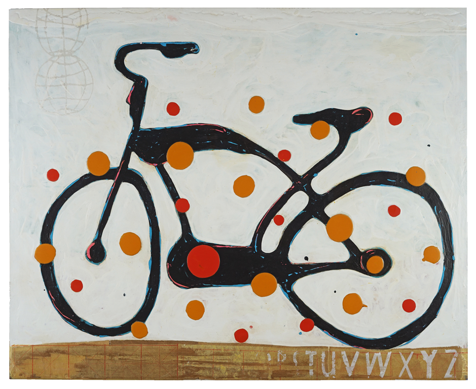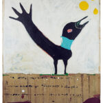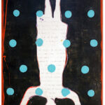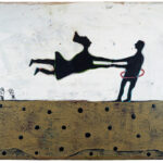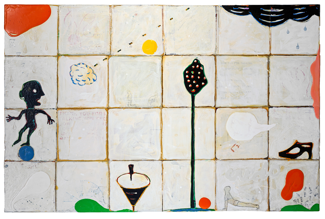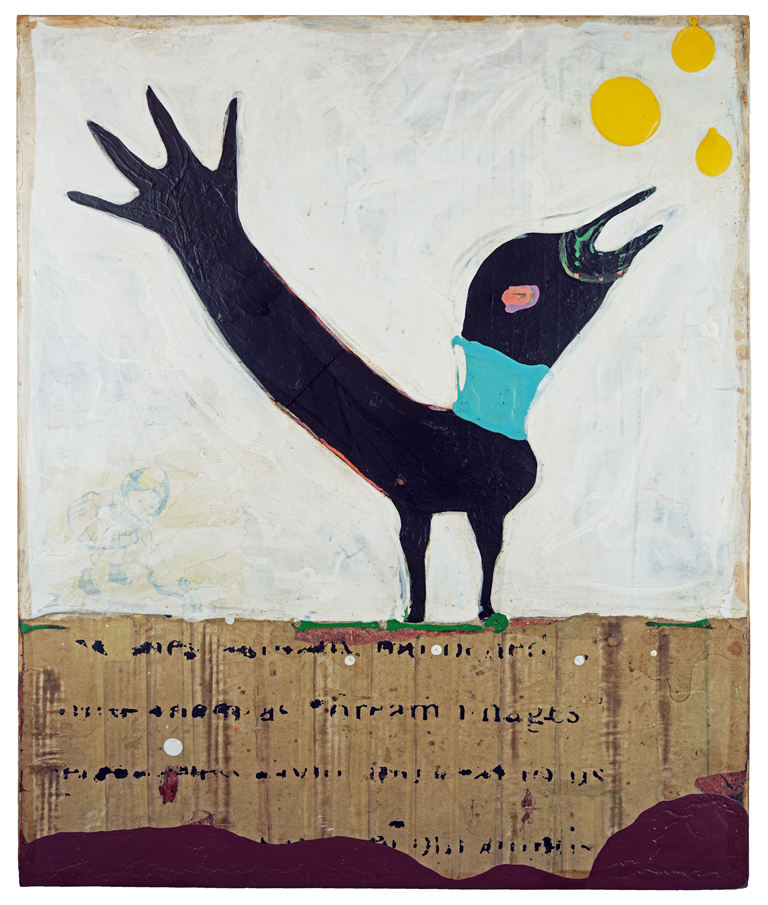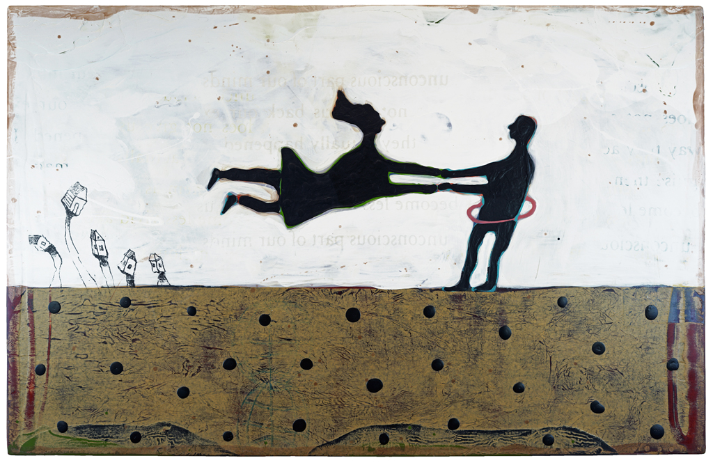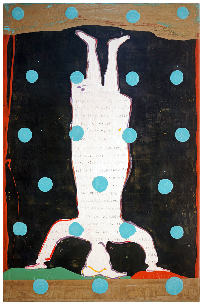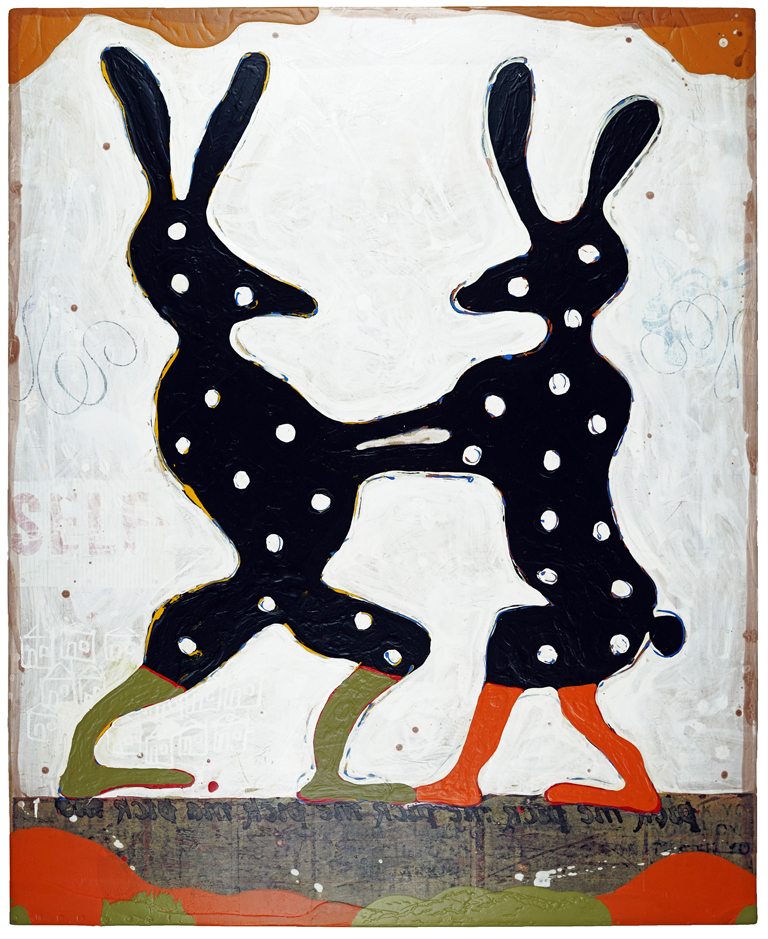 "Many of the figures that John Randall Nelson scrawls across his mixed-media, collaged backgrounds have the naive quality of outsider art, but this is just part of his carefully calibrated balancing act. These sly paintings conjure cartoons, found signage, and modern hieroglyphs, and tie them all together with lusciously patinated surfaces.