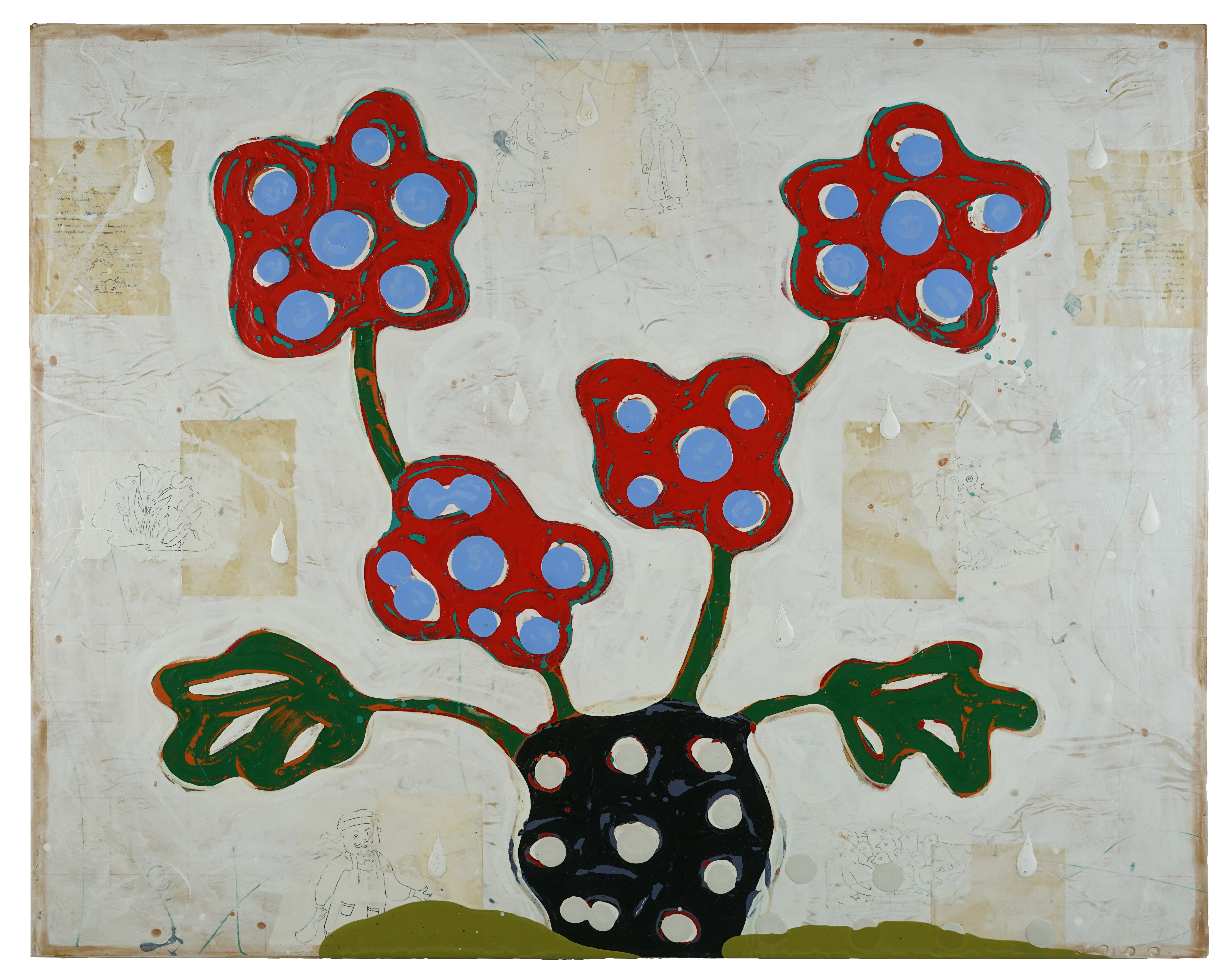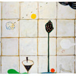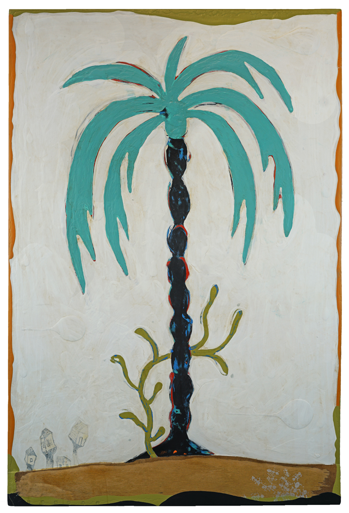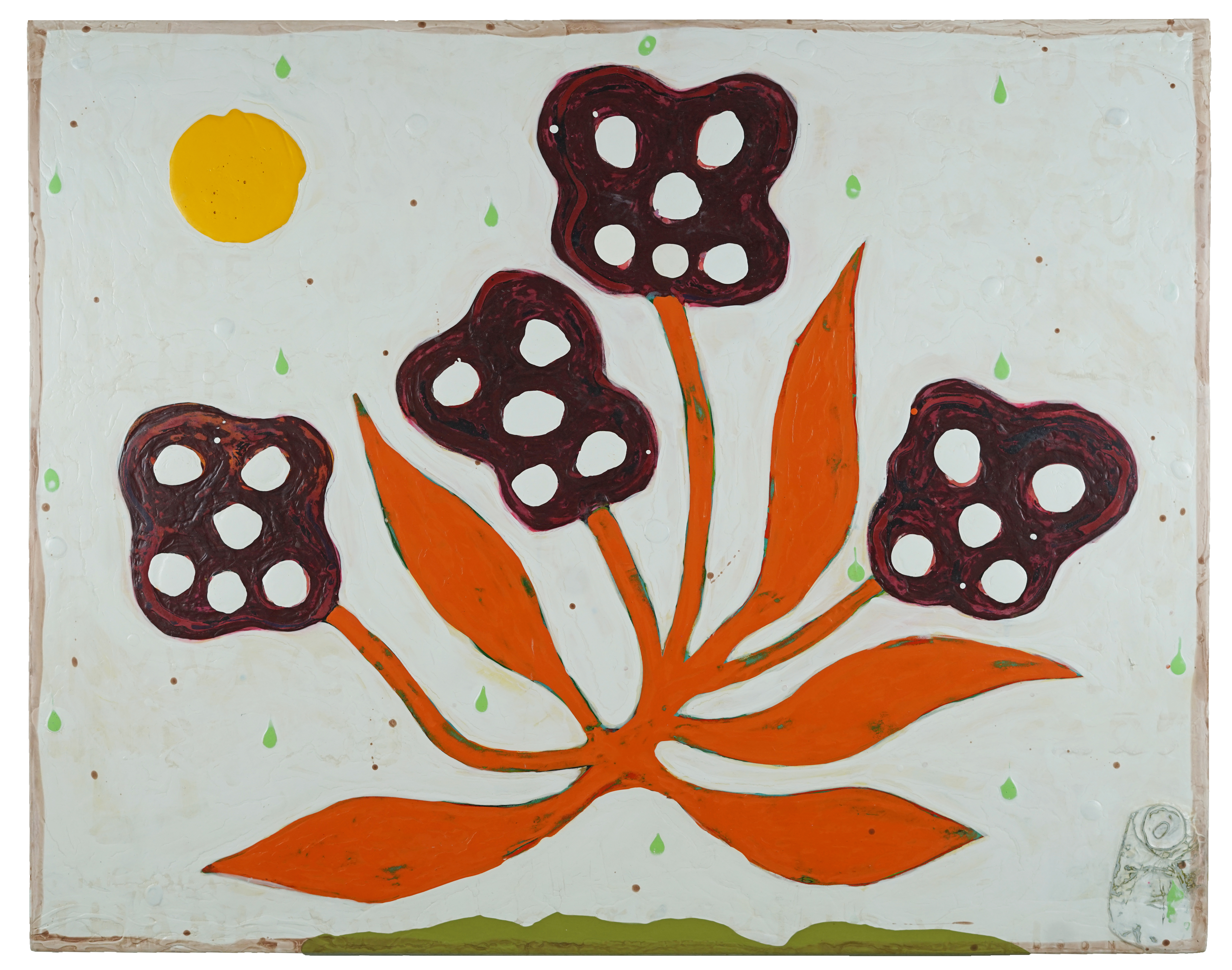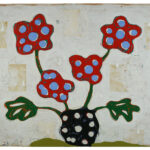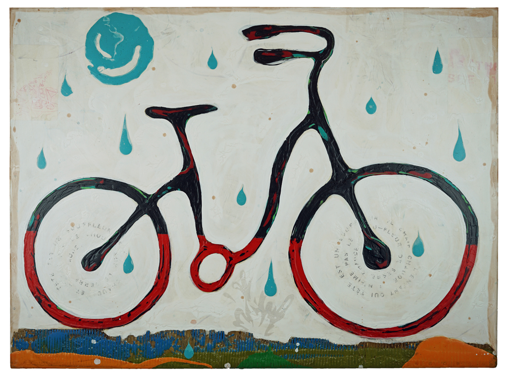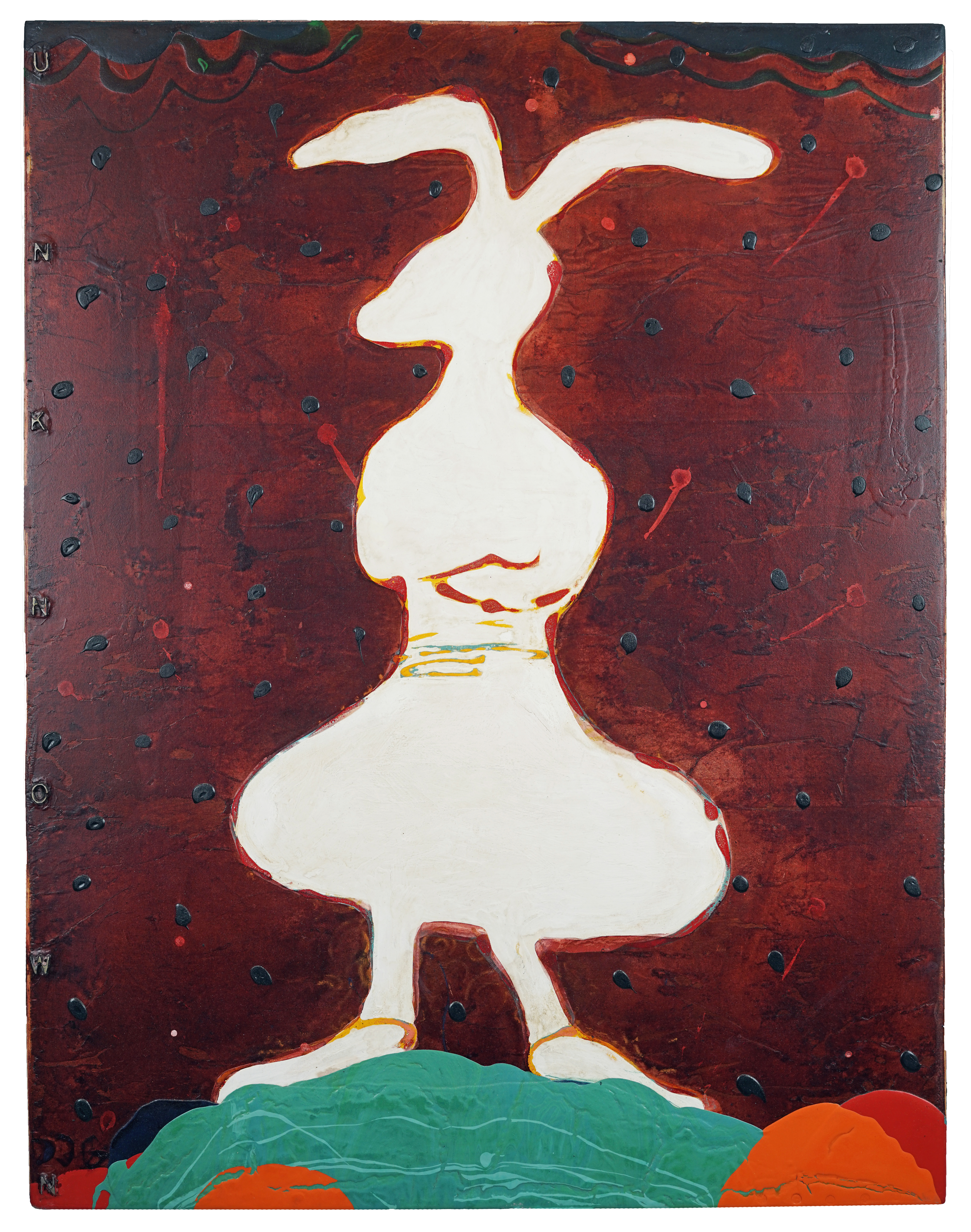 "Many of the figures that John Randall Nelson scrawls across his mixed-media, collaged backgrounds have the naive quality of outsider art, but this is just part of his carefully calibrated balancing act. These sly paintings conjure cartoons, found signage, and modern hieroglyphs, and tie them all together with lusciously patinated surfaces.