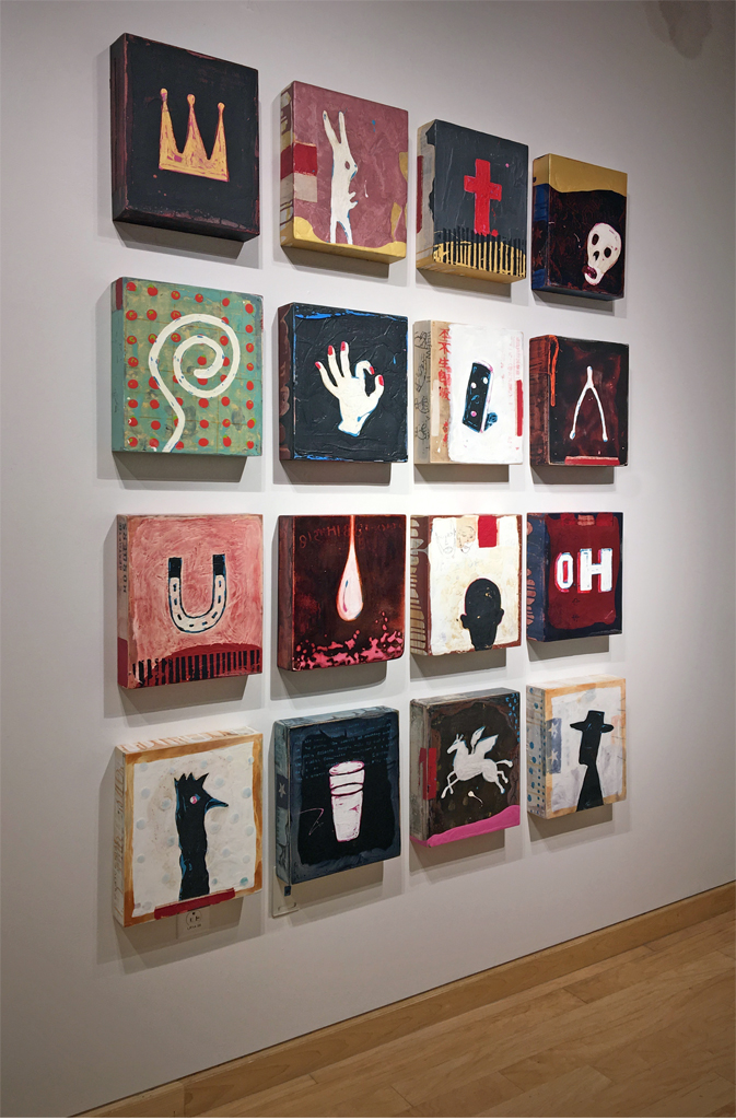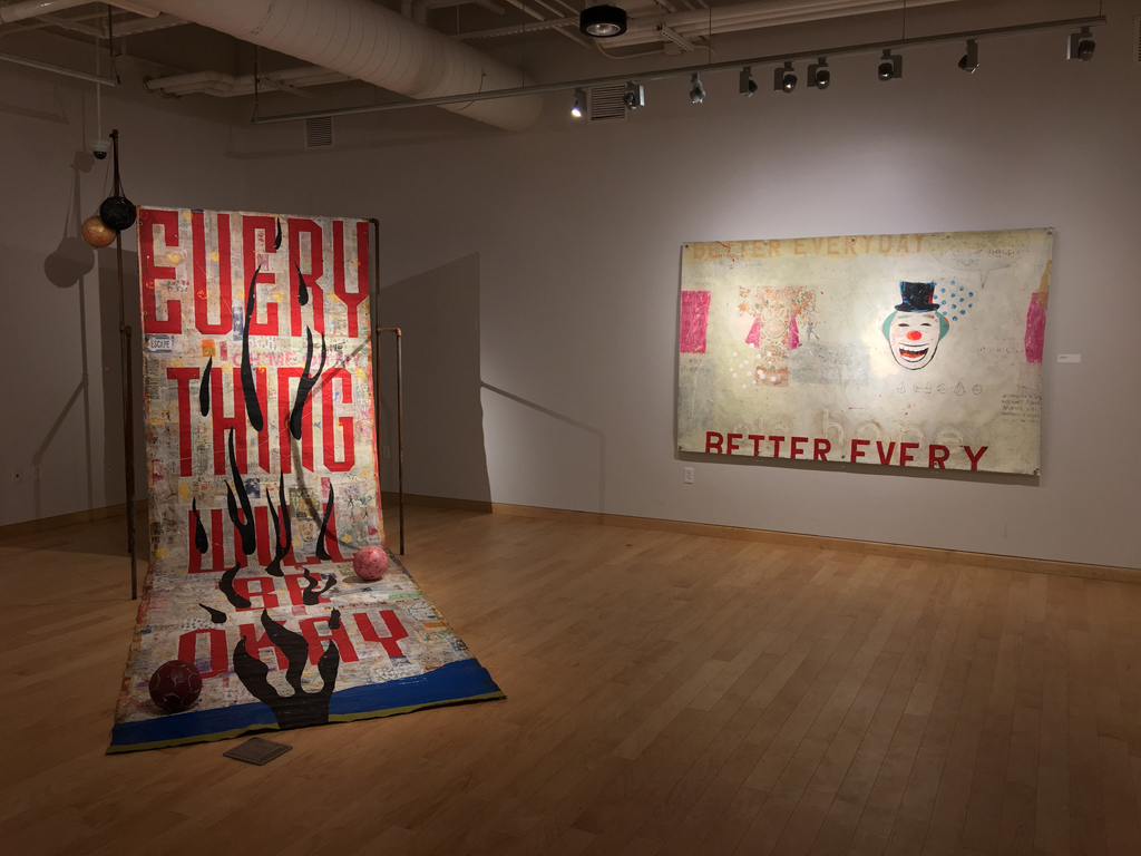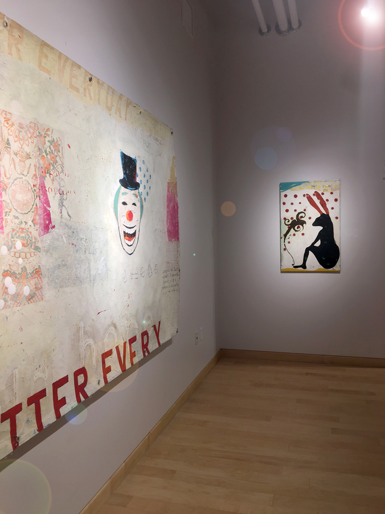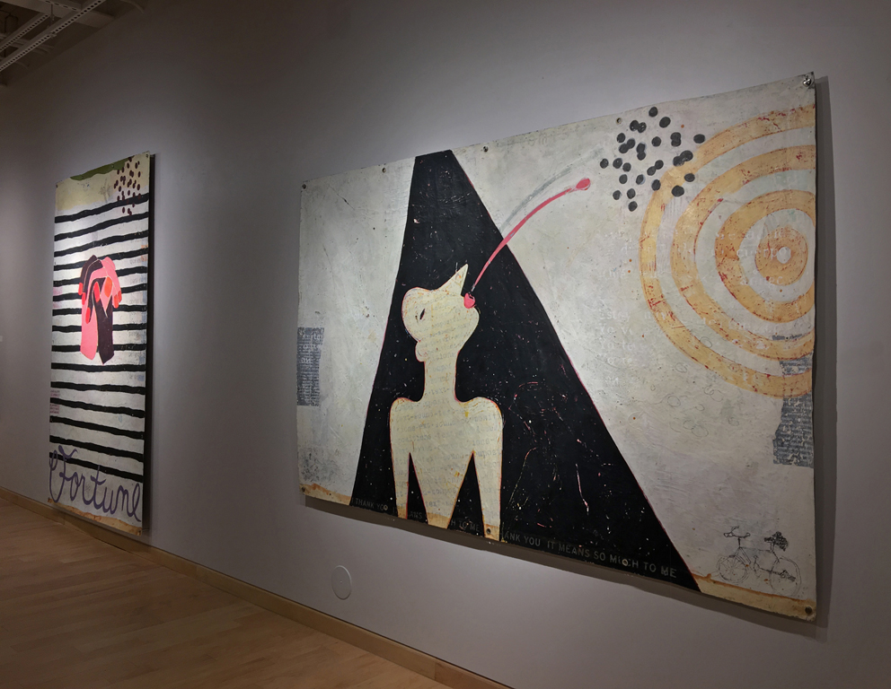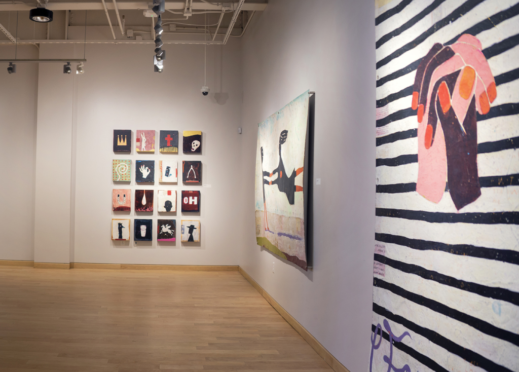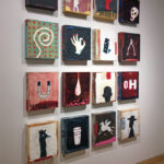 Windgate Gallery, University of Arkansas. 2018. Nelson’s faux-naive paintings depict simplified figures—dolls, puppets, and figurines—that feel familiar. While they echo outsider art, they incorporate faint text and decorative patterns that evoke subconscious associations. Though childlike in form, the work is not innocent. It’s layered with cryptic language and explores the tension between expression, symbols, and the psyche. Influenced by American folk artists, Nelson reimagines outsider aesthetics through a postmodern lens, creating narrative-driven, text-infused pieces.