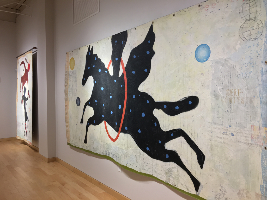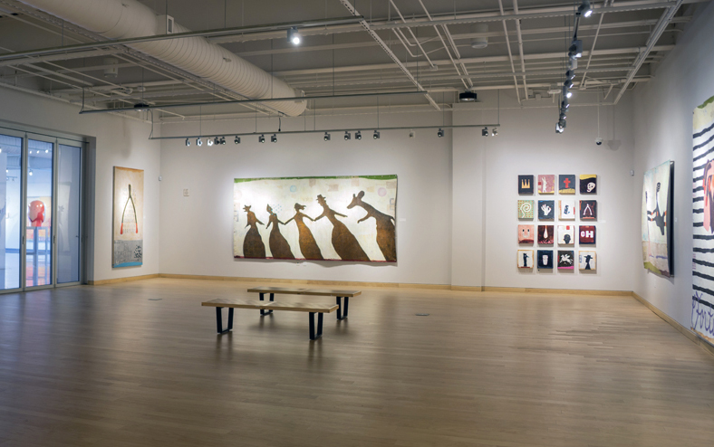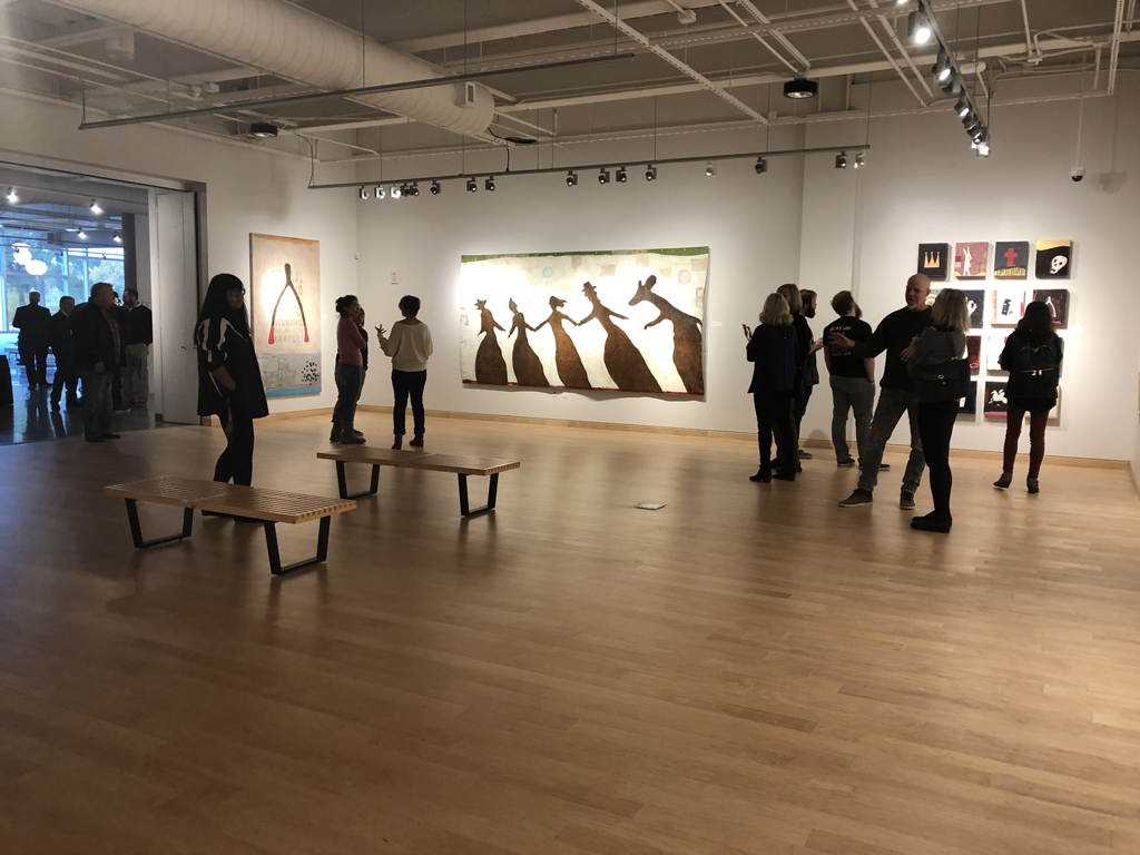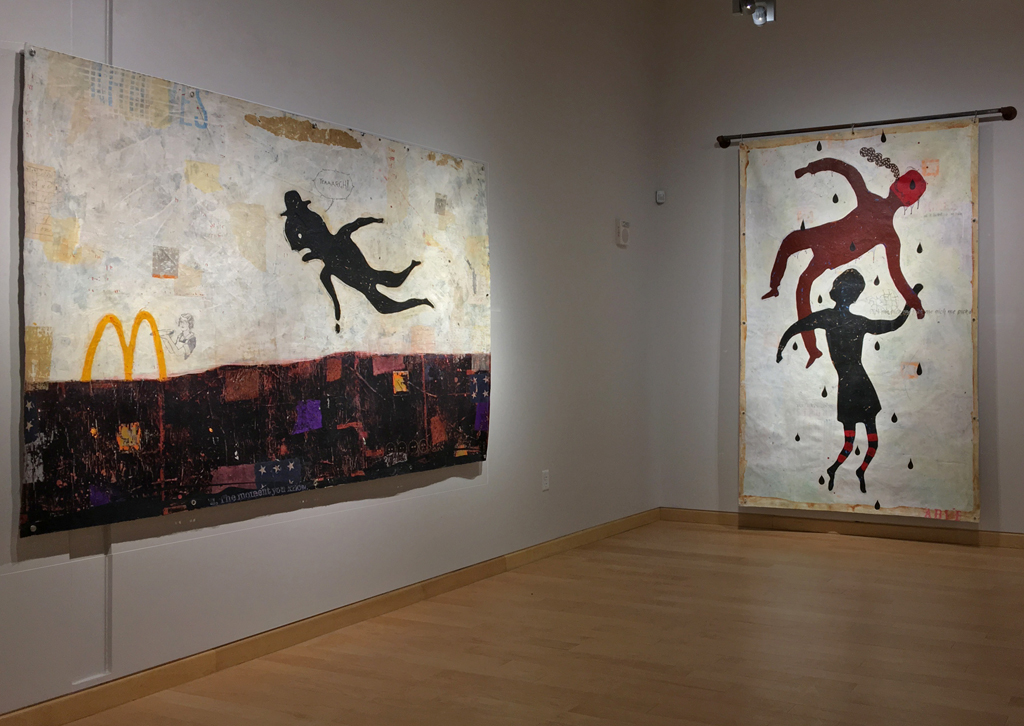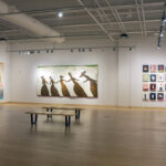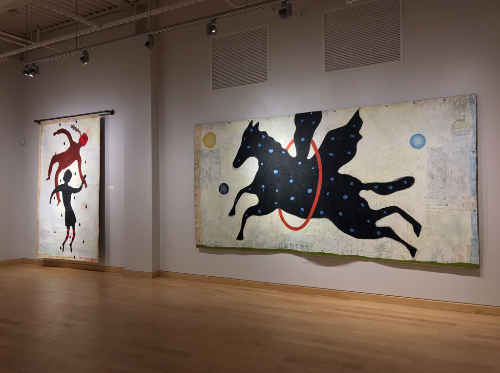 Windgate Gallery, University of Arkansas. 2018. Nelson’s faux-naive paintings depict simplified figures—dolls, puppets, and figurines—that feel familiar. While they echo outsider art, they incorporate faint text and decorative patterns that evoke subconscious associations. Though childlike in form, the work is not innocent. It’s layered with cryptic language and explores the tension between expression, symbols, and the psyche. Influenced by American folk artists, Nelson reimagines outsider aesthetics through a postmodern lens, creating narrative-driven, text-infused pieces.